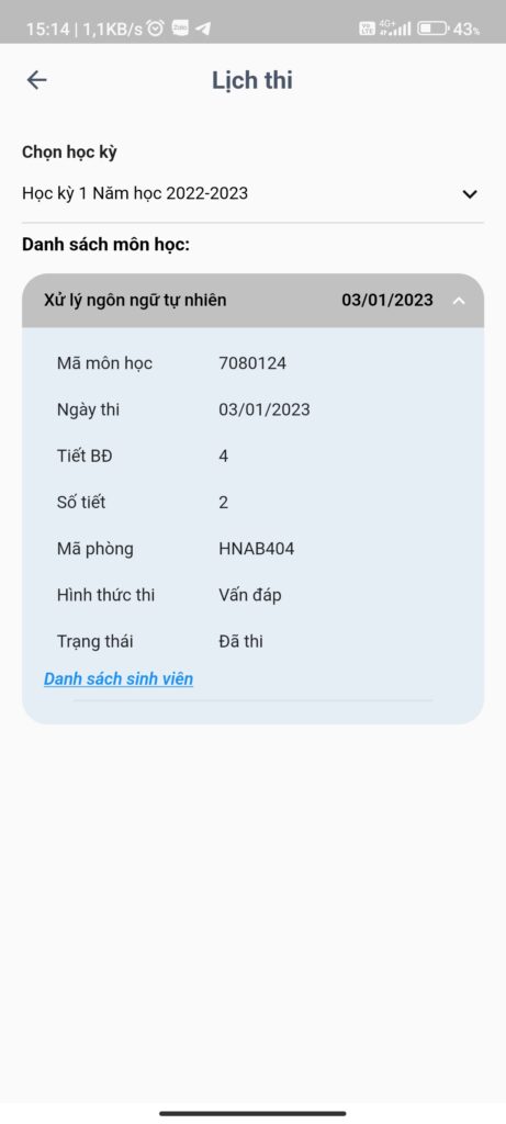 - Xem điểm thi: Sinh viên có thể xem điểm thi của mình trong các học kì đã được học.