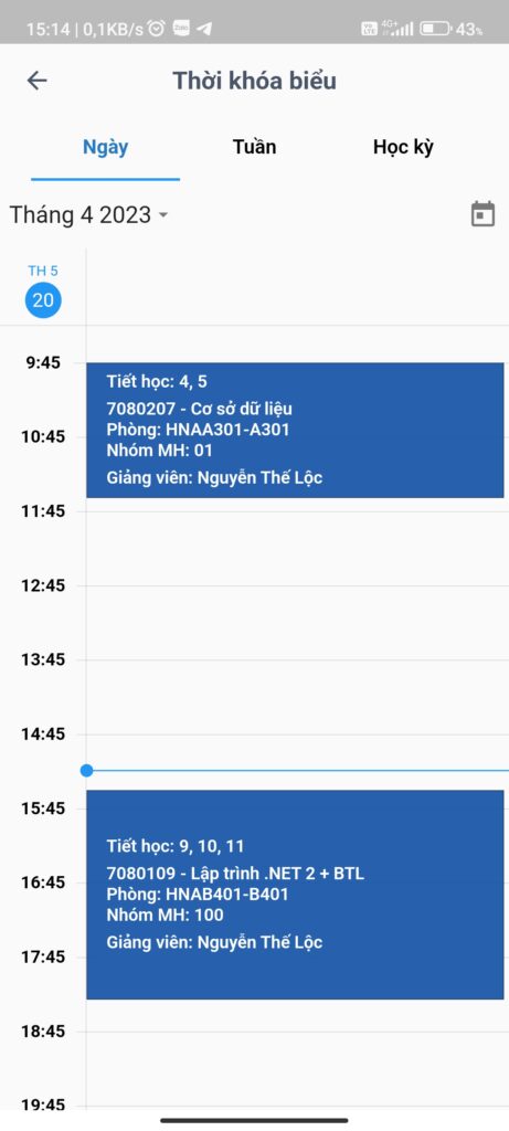 - Xem thời khóa biểu: Sinh viên có thể xem thời khóa biểu theo ngày và tuần để thuận tiện cho việc học, cũng có thể xem các môn học đã đăng ký theo học kỳ